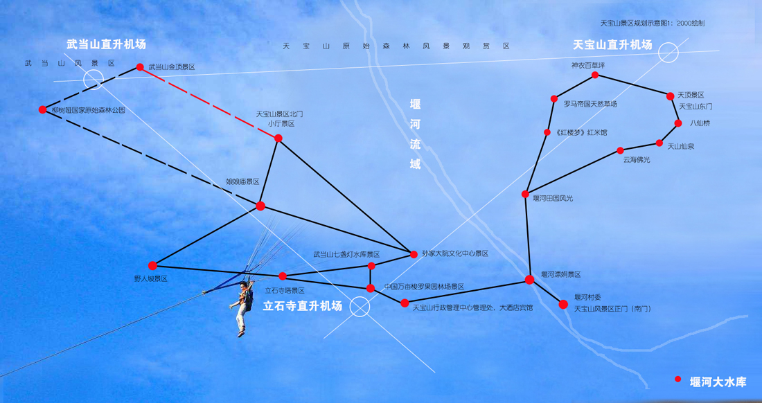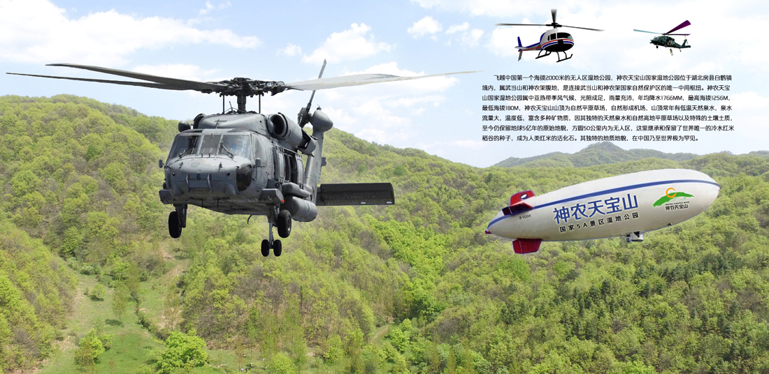 神农天宝山景区,因其独特的地质地貌,政府为了保存原始风貌,把人类活化石继续保存下去,严格要求必须进行保护性旅游资源开发,即可让我们零距离的走进原始天然山顶草场,一览世界罕见的风土风貌,又得保存各种林地资源,景区在开发设计上,经过多方考证,最后确定搭建3大游览直升机机场,一是在景区景点梭罗果园建设直升机机场,二是在天宝山主峰山顶草场建设直升机机场,三是在武当山山顶建设直升机机场。主峰山林为石径小道,唯有梭罗果园景点连接县城商业街,在三大机场各建设热气球飞艇升空草坪。这也在我国原始森林风景区旅游区内少见。同时在原始山林中建盖木屋别墅,由景区管理处直接管理,以供远地游客短期,中期,以及长期旅游居住养老等提供标准服务,这种新型的旅游度假居住模式也是我国景区首创,以达到“天人合一”的新型旅游归隐需求。